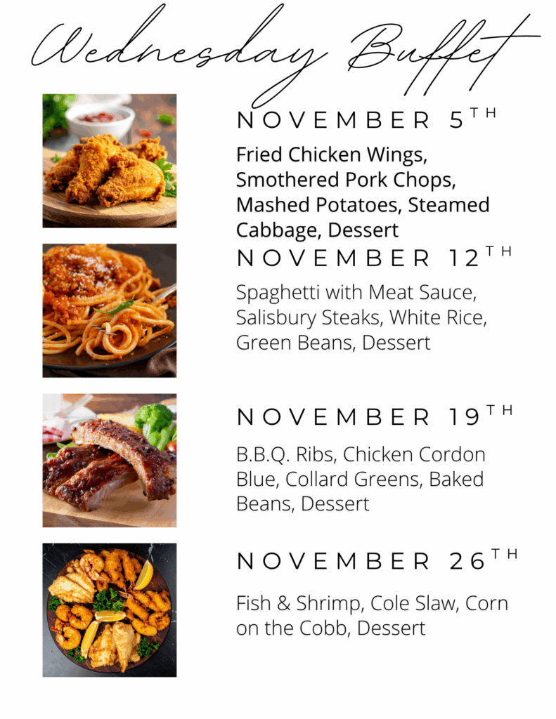 Come enjoy good food and good friends every Wednesday from 11:30 AM to 2 PM