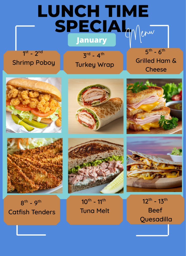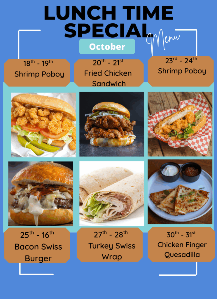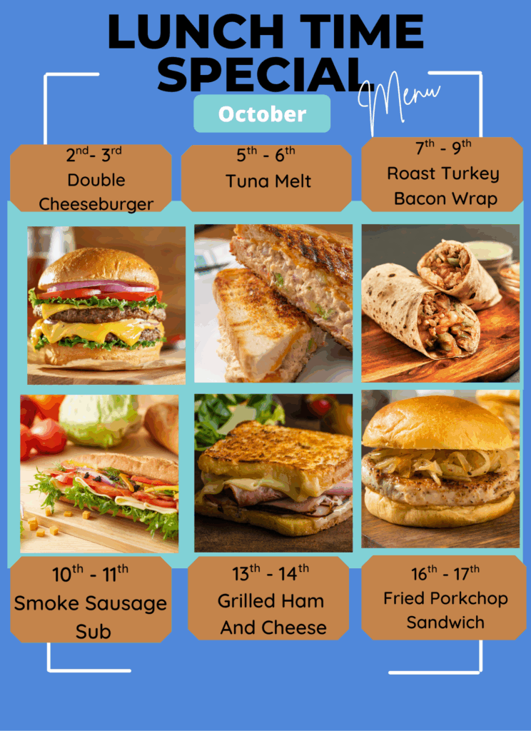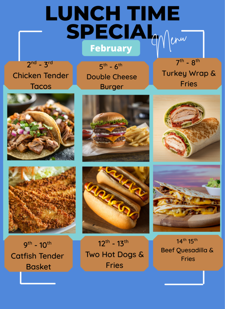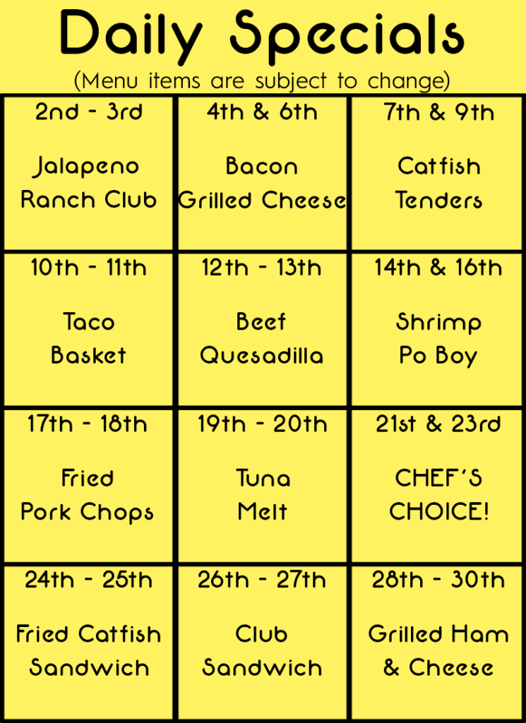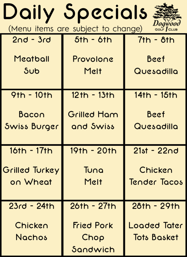 The Dogwood Grill offers a rotating daily lunch special from 11 AM to 4 PM each week.